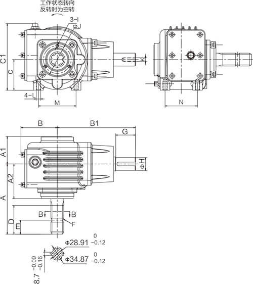 | 型號(hào) | A | A1 | A2 | B | B1 | C | C1 | D | E | F | G | H | I | J | K | L | M | N | 齒輪模數(shù) | 傳動(dòng)比 |